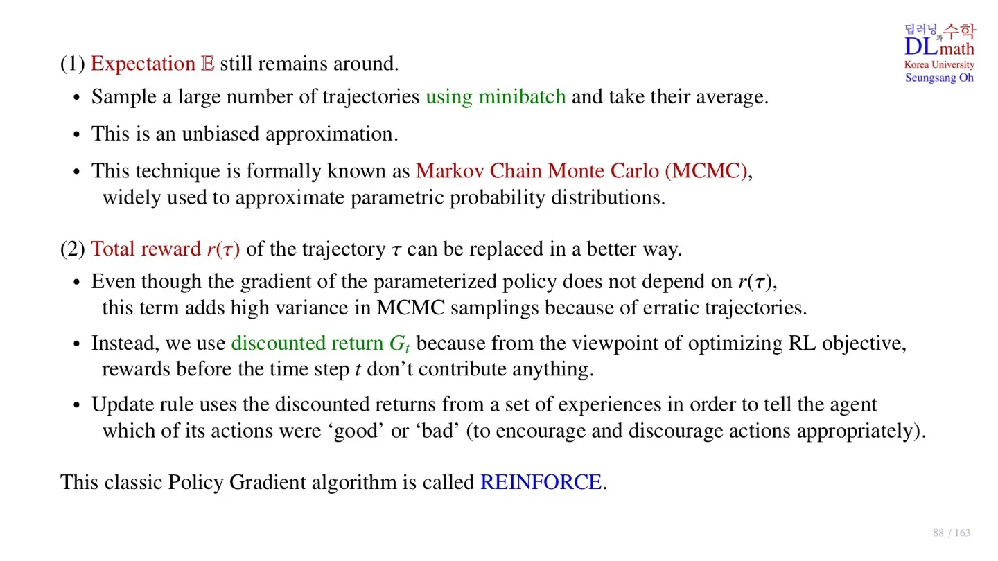 - Policy Gradient Theorem의 expectation은 sampling을 통해 근사 가능하다.