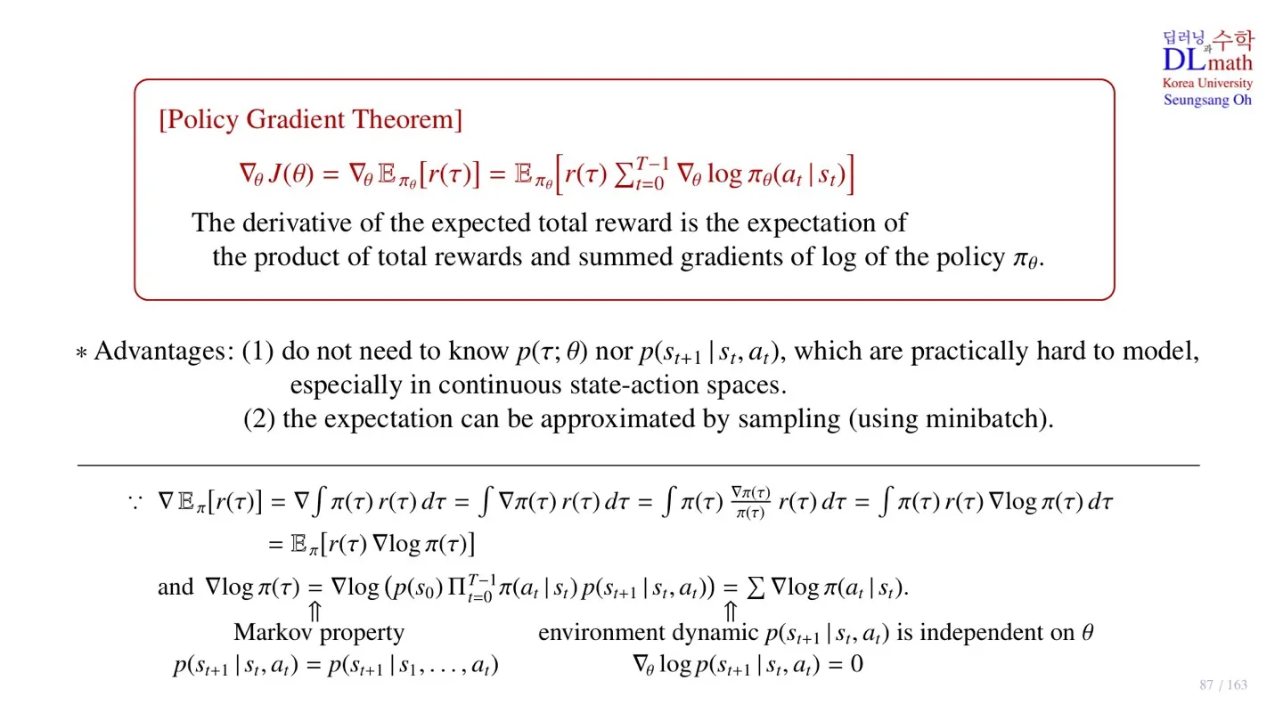 - Policy Gradient Theorem은 state transition probability 없이 계산 가능하다.