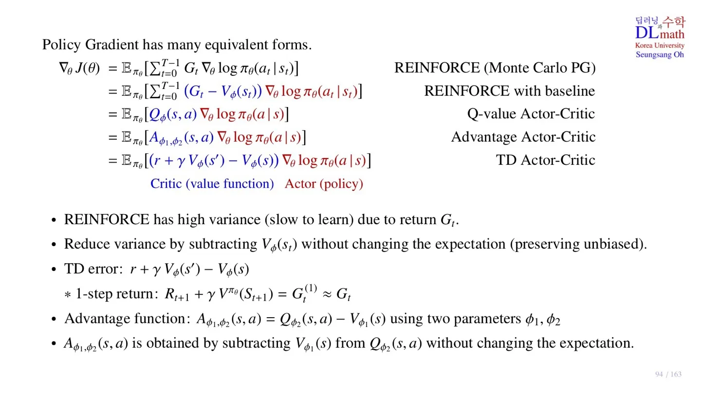 마지막으로 Advantage Actor-Critic은 Q-value Actor-Critic에서 baseline을 추가한 모델이다. 따라서 Expectation의 변화가 없다.