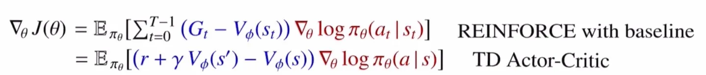이를 해결하기 위해 Baseline으로 를 빼줌으로써 variance를 줄인다. 이때 는 action과 관계가 없어 expectation 값에 영향을 주지 않는다.