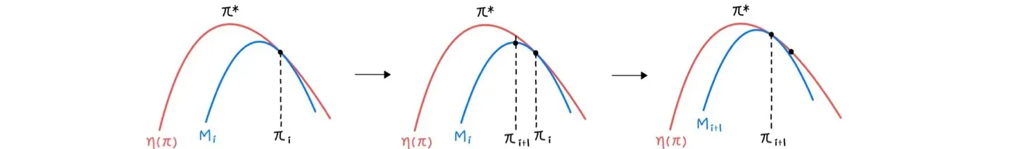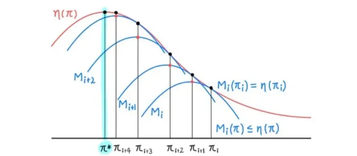 ⇒η(πi)=Mi(πi)≤Mi(πi+1)≤η(πi+1)for πi+1=argπmaxMi(π)