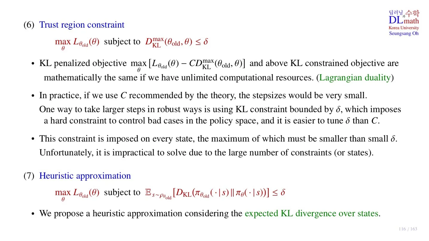 - 따라서 위 제약조건 하에서 Lθold(θ)의 maximize해주는 θ가 new policy이다.