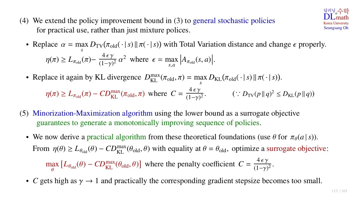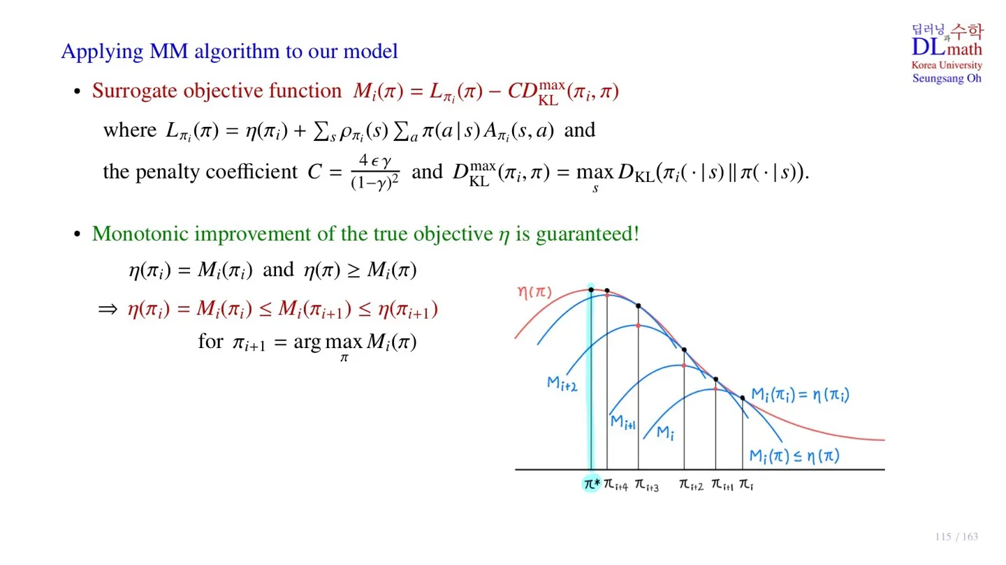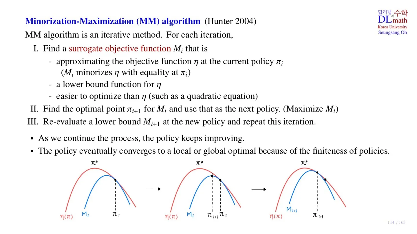 - Minorization-Maximization algorithm의 핵심은 surrogate object function을 maximize하는 policy를 찾는 것이었다.