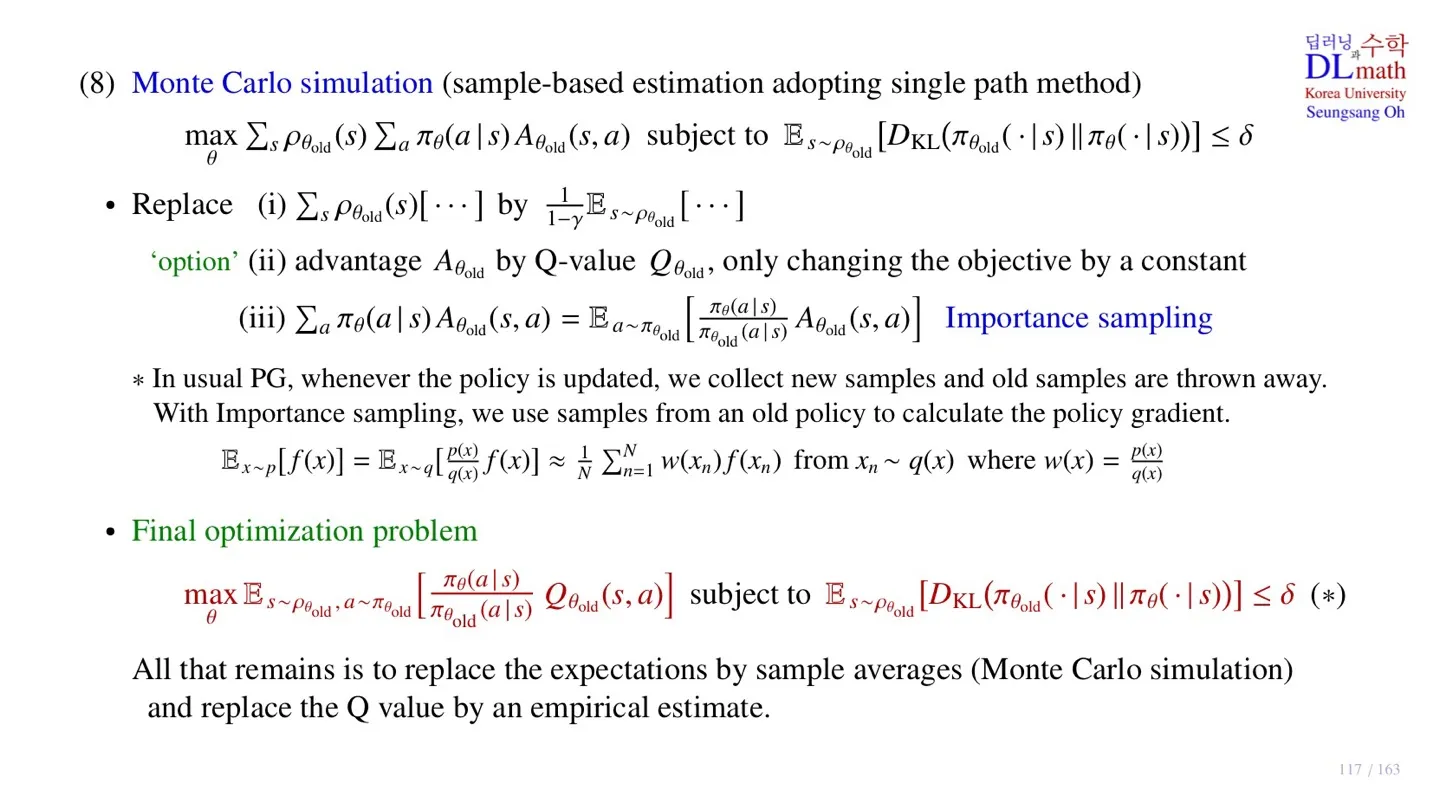 - Constraint 식은 old policy에 대하여 expectation을 하는 것을 확인할 수 있다.