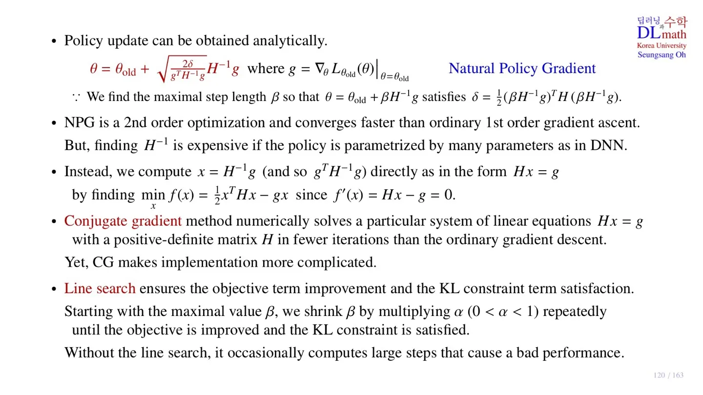 우리는 Natural gradient descent를 통해 new policy를 구할 수 있다.