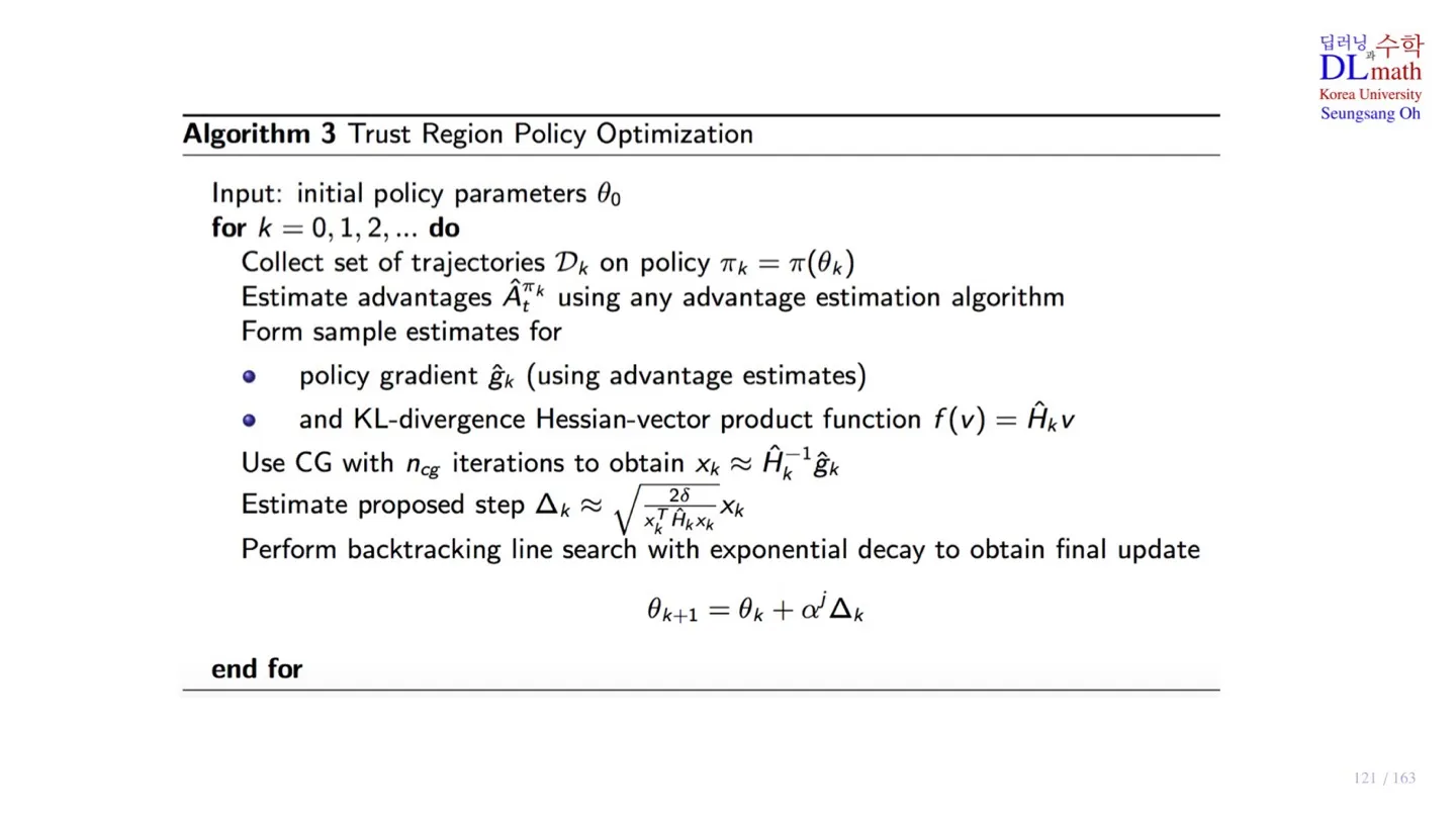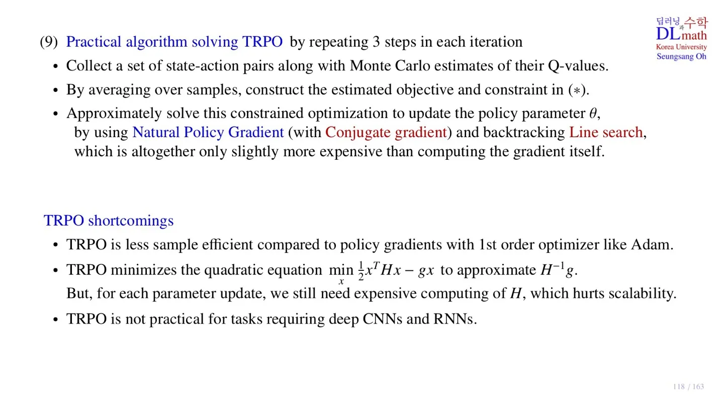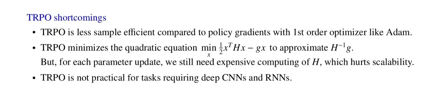 - TRPO는 성능이 향상된다는 이점이 있지만, 그와 동시에 연산량이 많다는 한계가 존재한다.