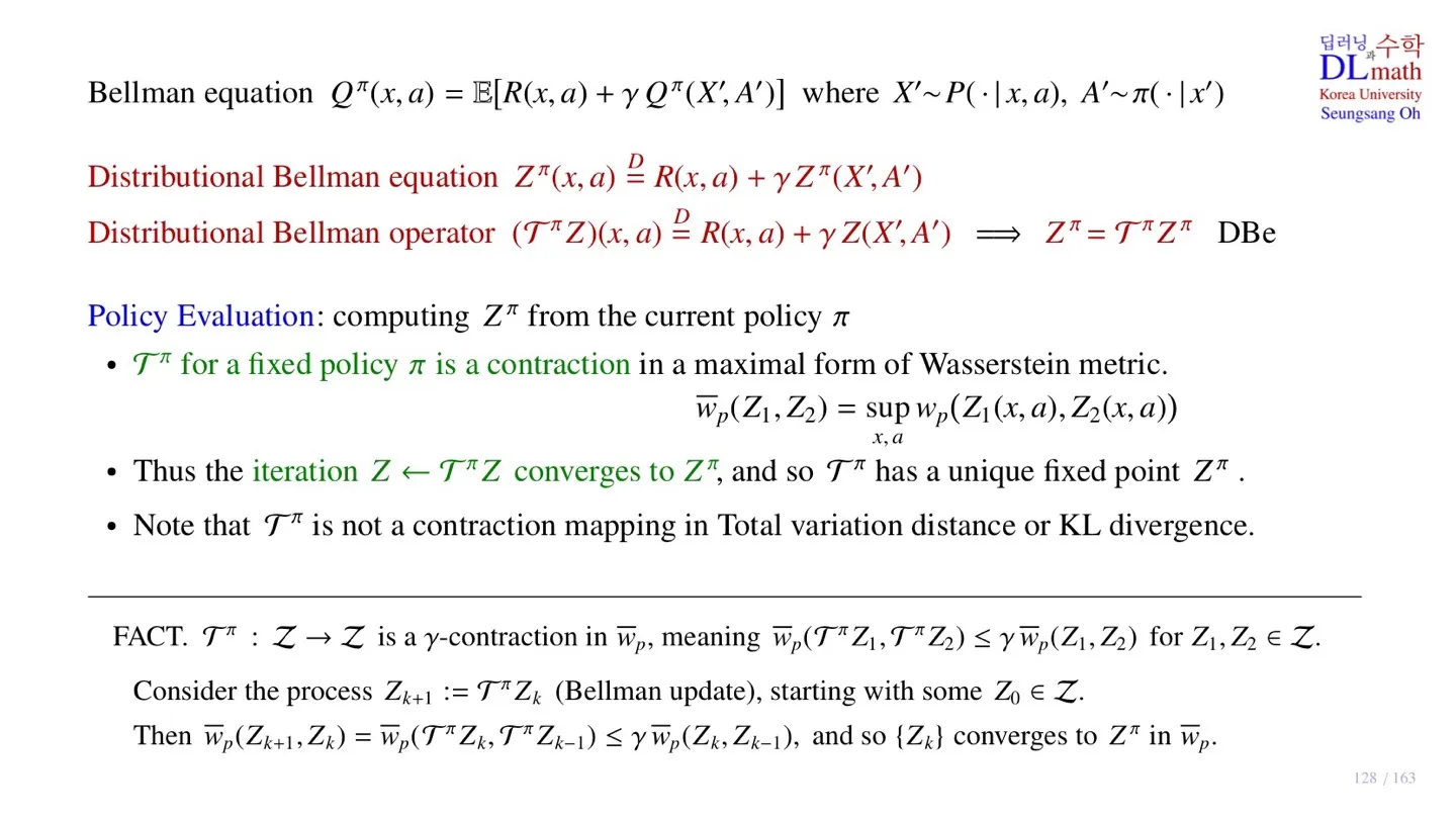 - Policy π가 주어졌을 때, 해당 policy의 operator Tπ 가 Wasserstein metric의 maximual form 안에서 contraction이 된다.
