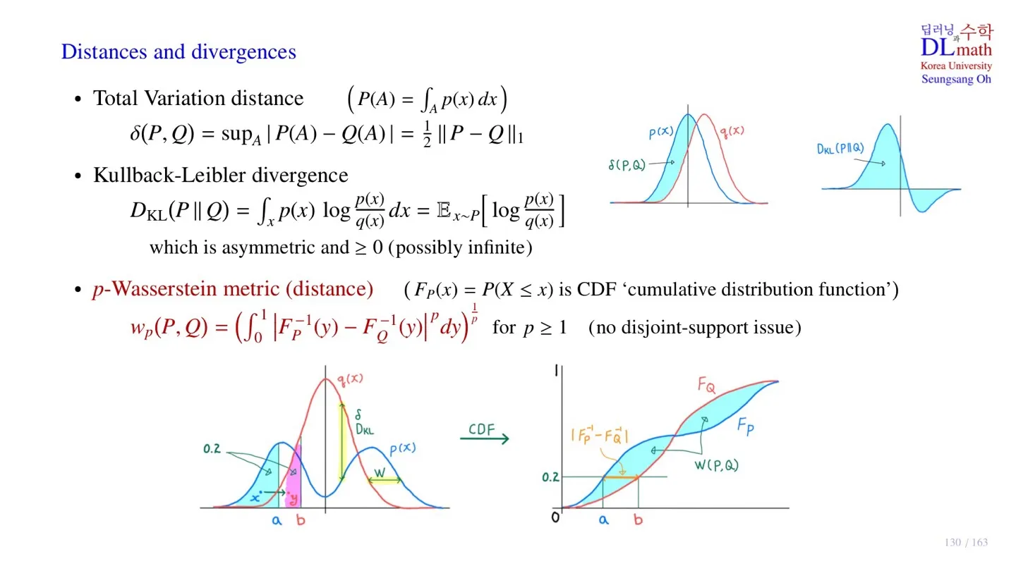 - 우리는 두 분포 사이에 Wasserstein metric을 정의할 수 있다.