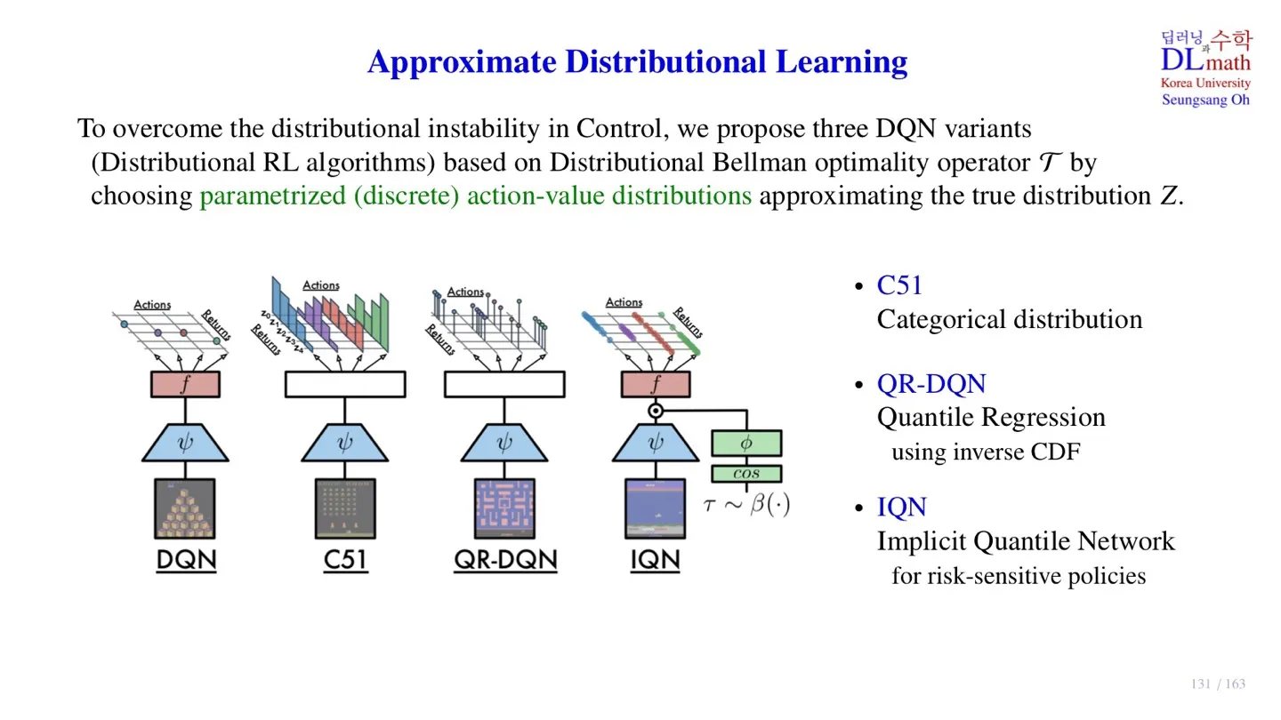 - 이를 DQN에 적용한 것이 C51, QR-DQN, IQN이다.