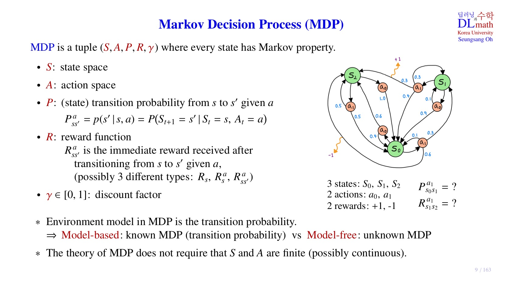 R : reward function, 현재 state와 action에서 미래의 state로 이동했을 때 얻게 될 reward 의미.