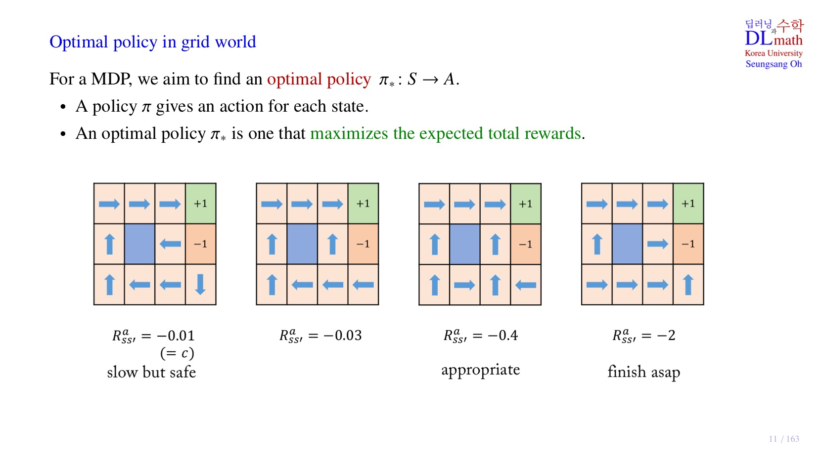 - 각 small negative reward마다 optimal policy를 갖는다.