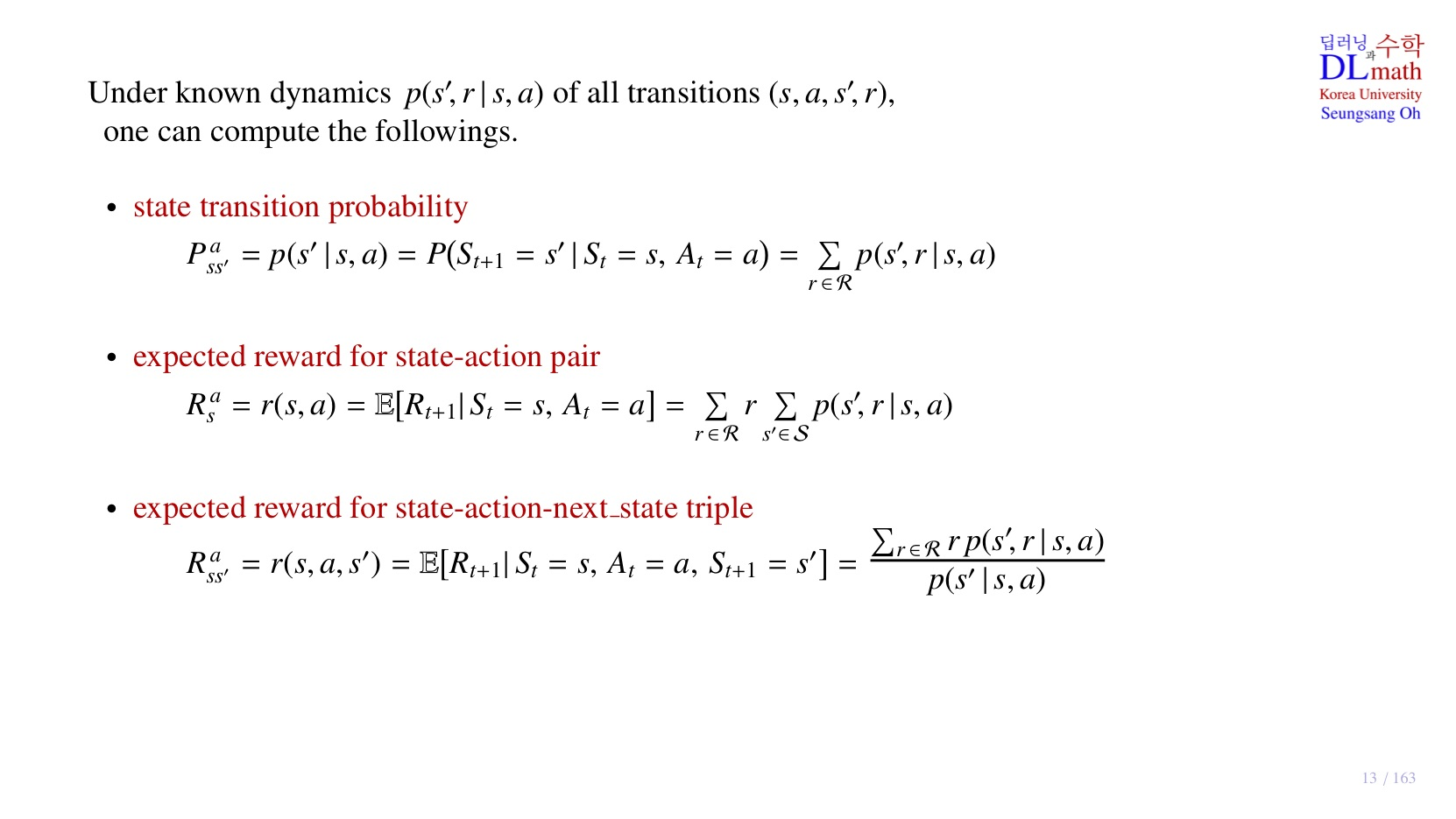 Rss′a=r(s,a,s′)=E[Rt+1∣St=s,At=a,St+1=s′]=p(s′∣s,a)∑r∈Rrp(s′,r∣s,a)