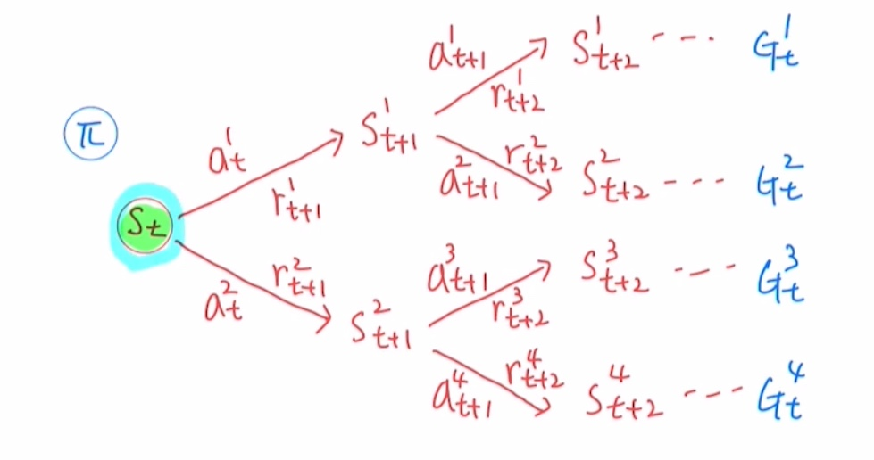 - 해당 state에서 미래에 받을 수 있는 Reward 시나리오, Return, Gt