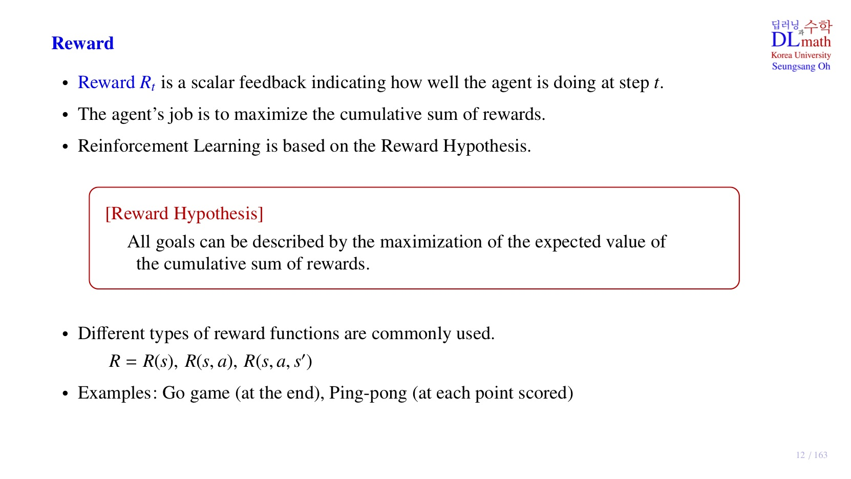 - 시간 t에서 agent의 행동에 대한 피드백으로 스칼라값이다.