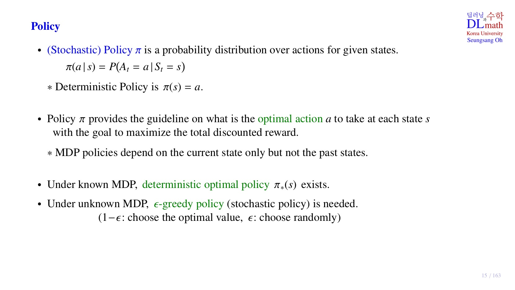 - π:S→A, 주어진 state에서 어떤 action을 취할지에 대한 확률 분포이다.