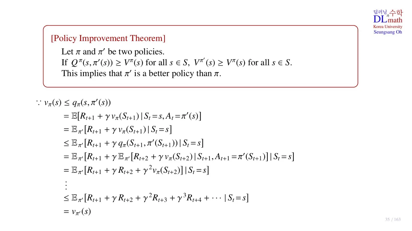 - Policy Improvement Theorem에 대해 증명하였다.