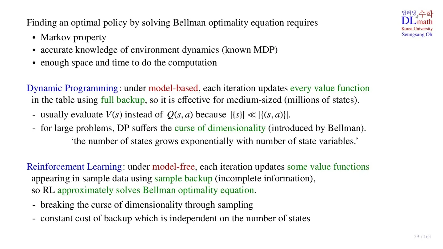 - 연산량의 관점에서 Dynamic Programming과 Reinforcement Learning을 비교하였다.