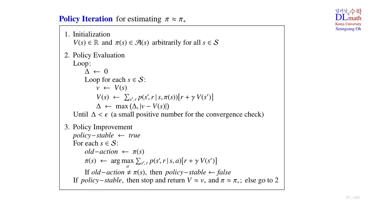 - Policy Iteration의 pseudo code에 대해 살펴보았다.