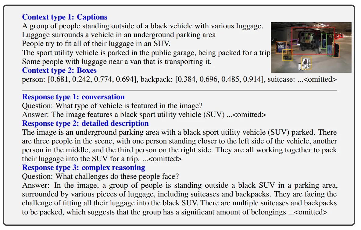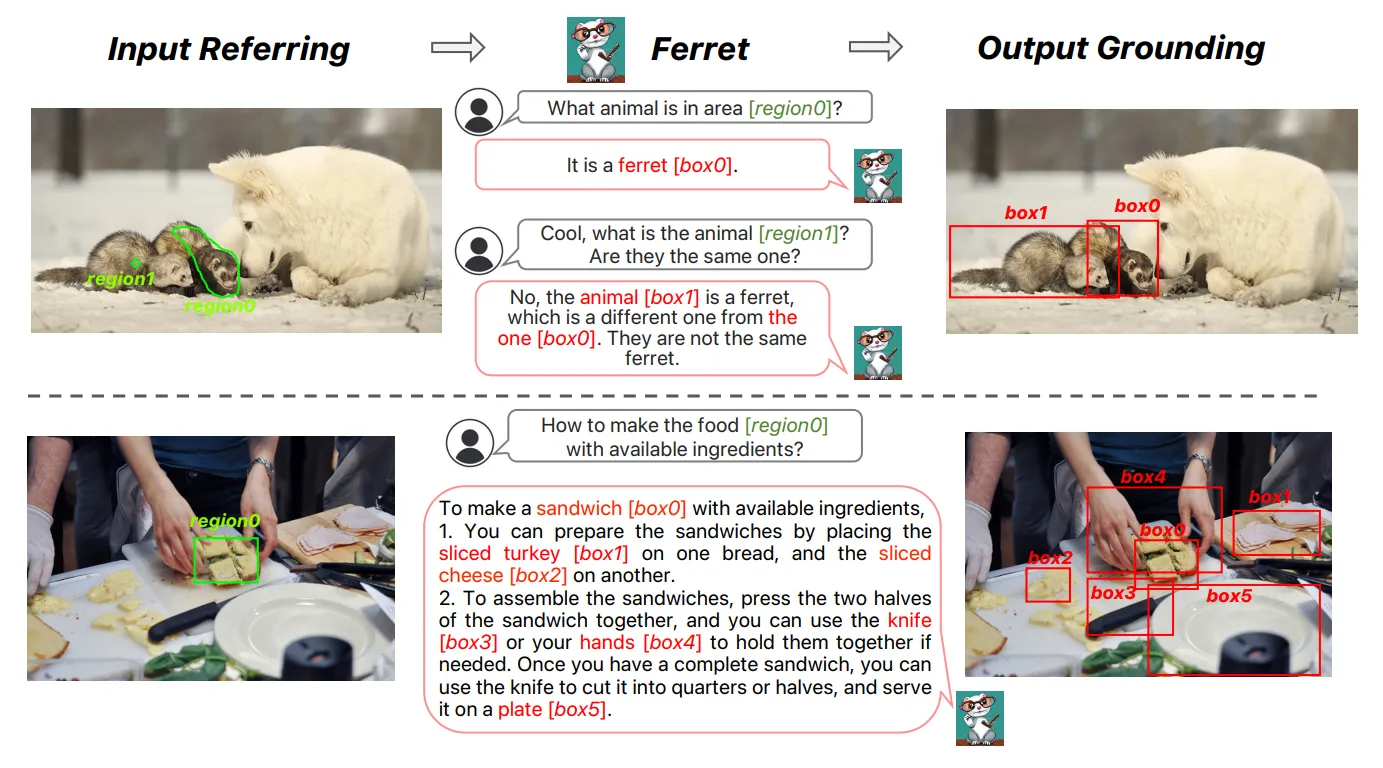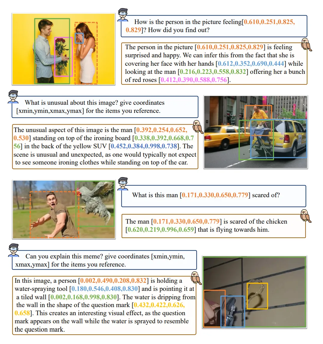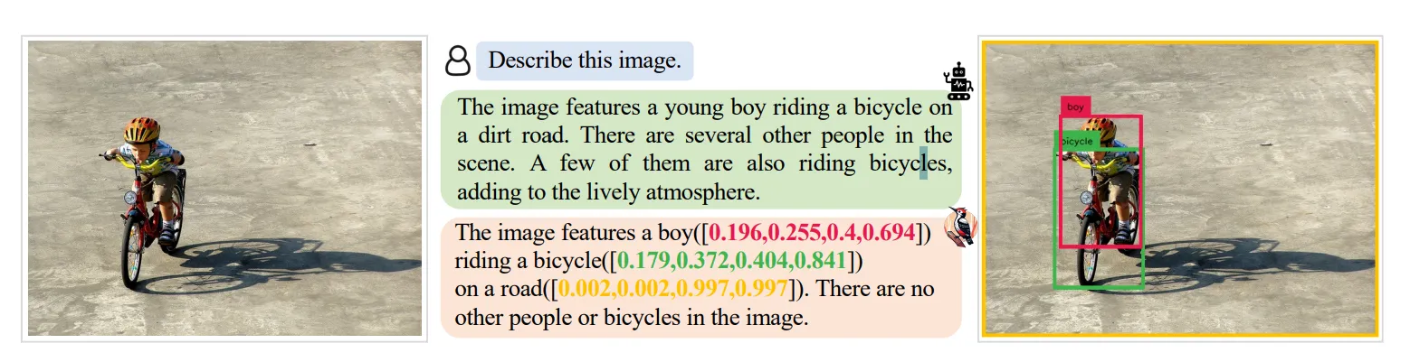 - Granularity Support (더 세밀한 정보 처리): 단순히 이미지에 대한 설명을 요구하는 것이 아닌, 이미지 속 특정 영역에 상자를 만들거나, 클릭을 하여 원하는 대상을 지정하는 것이 가능합니다.