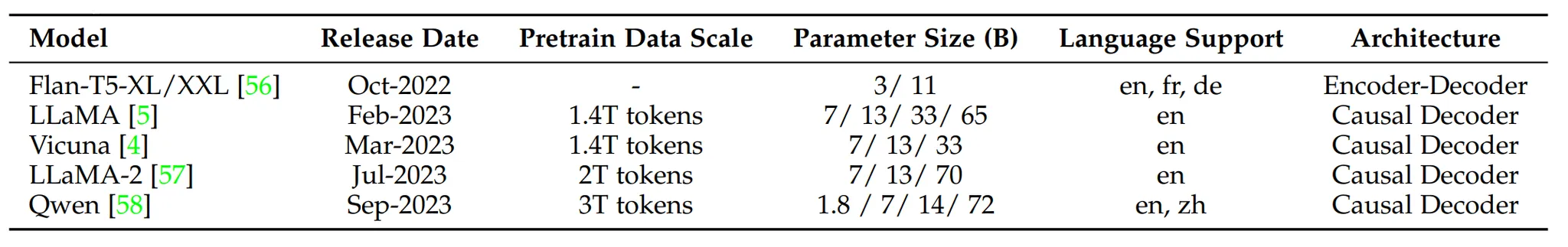 TABLE 2: A summary of commonly used open-sourced LLMs. en, zh, fr, and de stand for English, Chinese, French, and German, respectively.