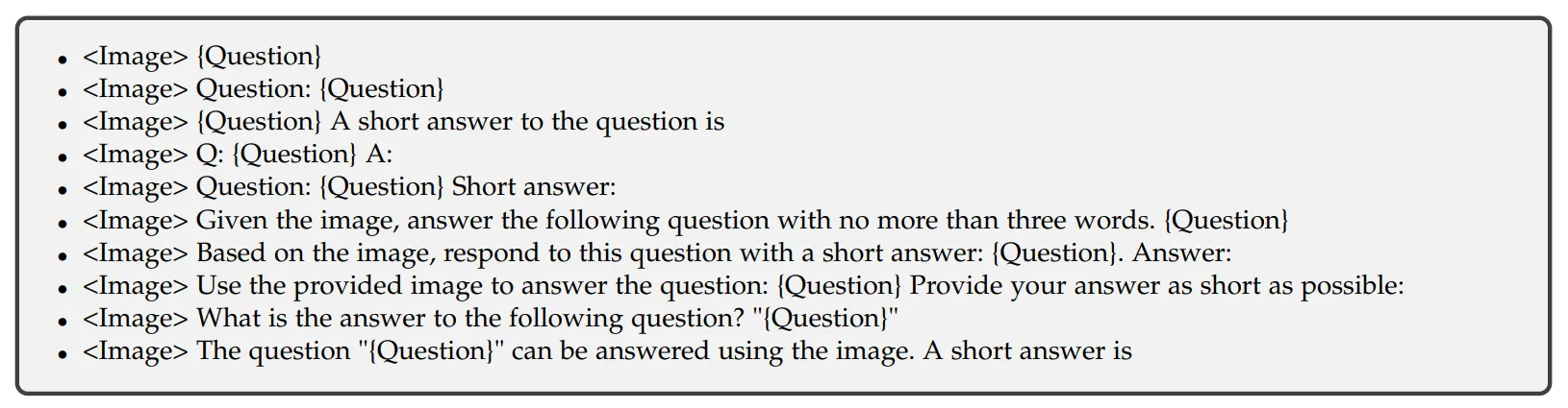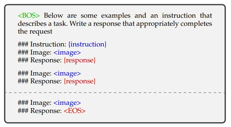 TABLE 9: A simplified example of the template to structure an M-ICL query, adapted from [98]. For illustration, we list two in-context examples and a query divided by a dashed line. {instruction} and {response} are texts from the data sample. is a placeholder to represent the multimodal input (an image in this case). and are tokens denoting the start and the end of the input to the LLM, respectively.