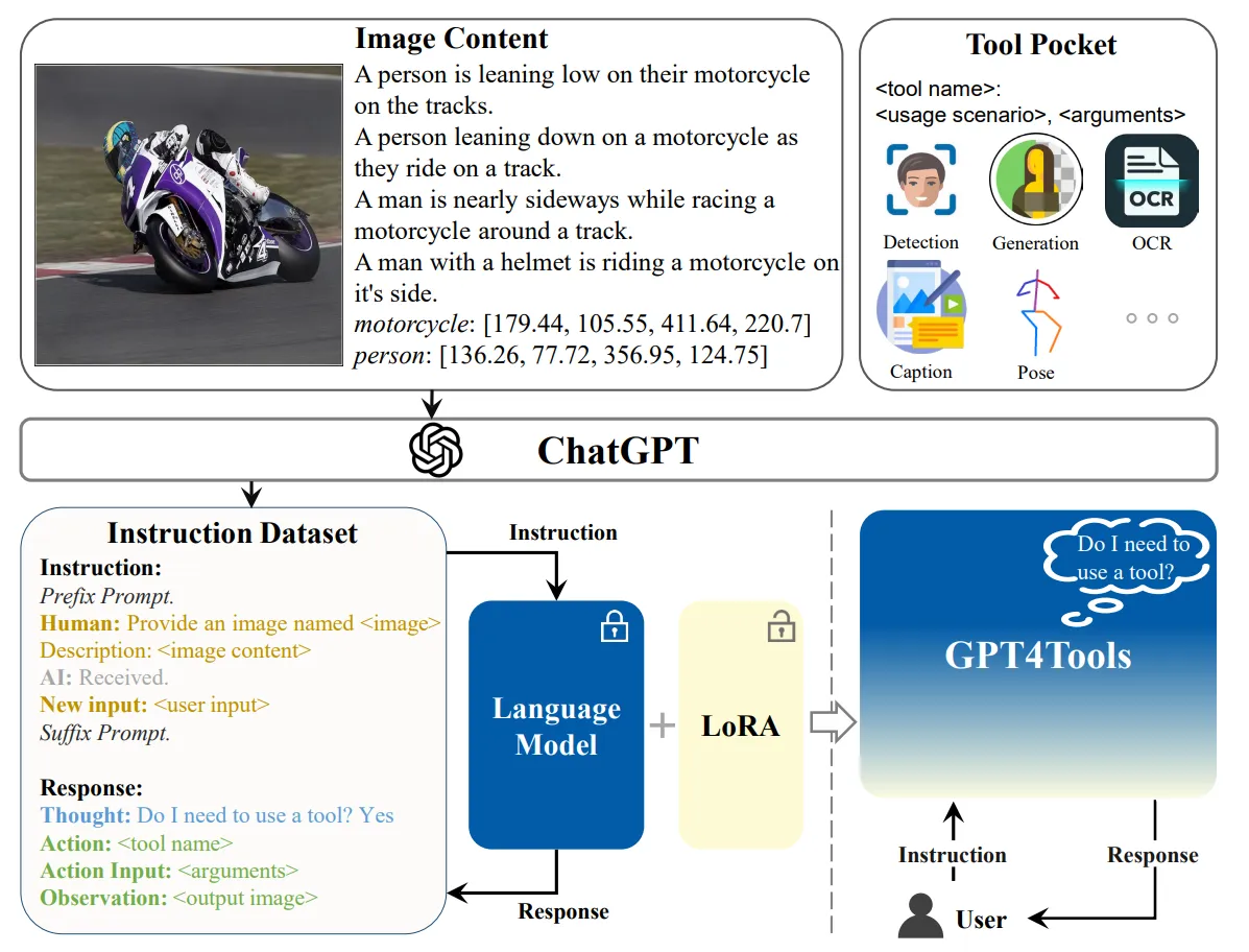 - GPT4Tools는 LLM이 외부 도구를 더 효과적으로 '계획하고 사용하는' 능력을 향상시키기 위해, 도구 사용과 관련된 새로운 지시어 훈련 데이터셋을 만들어서 모델을 파인튜닝했습니다.