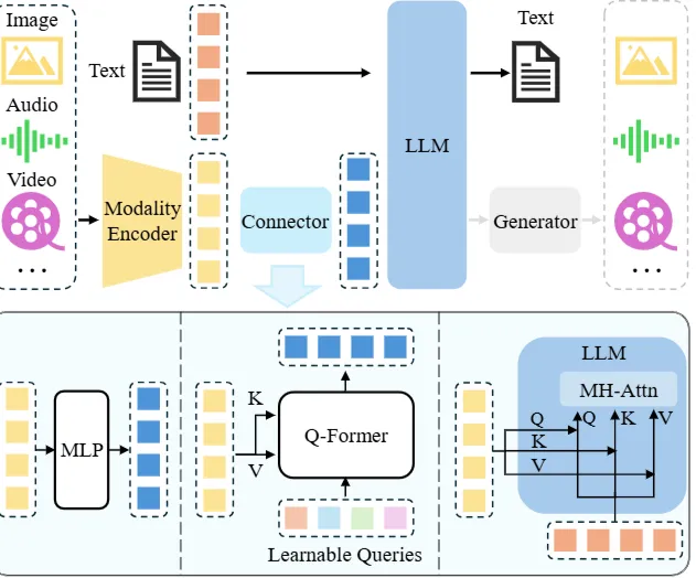Fig. 2: An illustration of typical MLLM architecture. It includes an encoder, a connector, and a LLM. An optional generator can be attached to the LLM to generate more modalities besides text. The encoder takes in images, audios or videos and outputs features, which are processed by the connector so that the LLM can better understand. There are broadly three types of connectors: projection-based, querybased, and fusion-based connectors. The former two types adopt token-level fusion, processing features into tokens to be sent along with text tokens, while the last type enables a feature-level fusion inside the LLM.