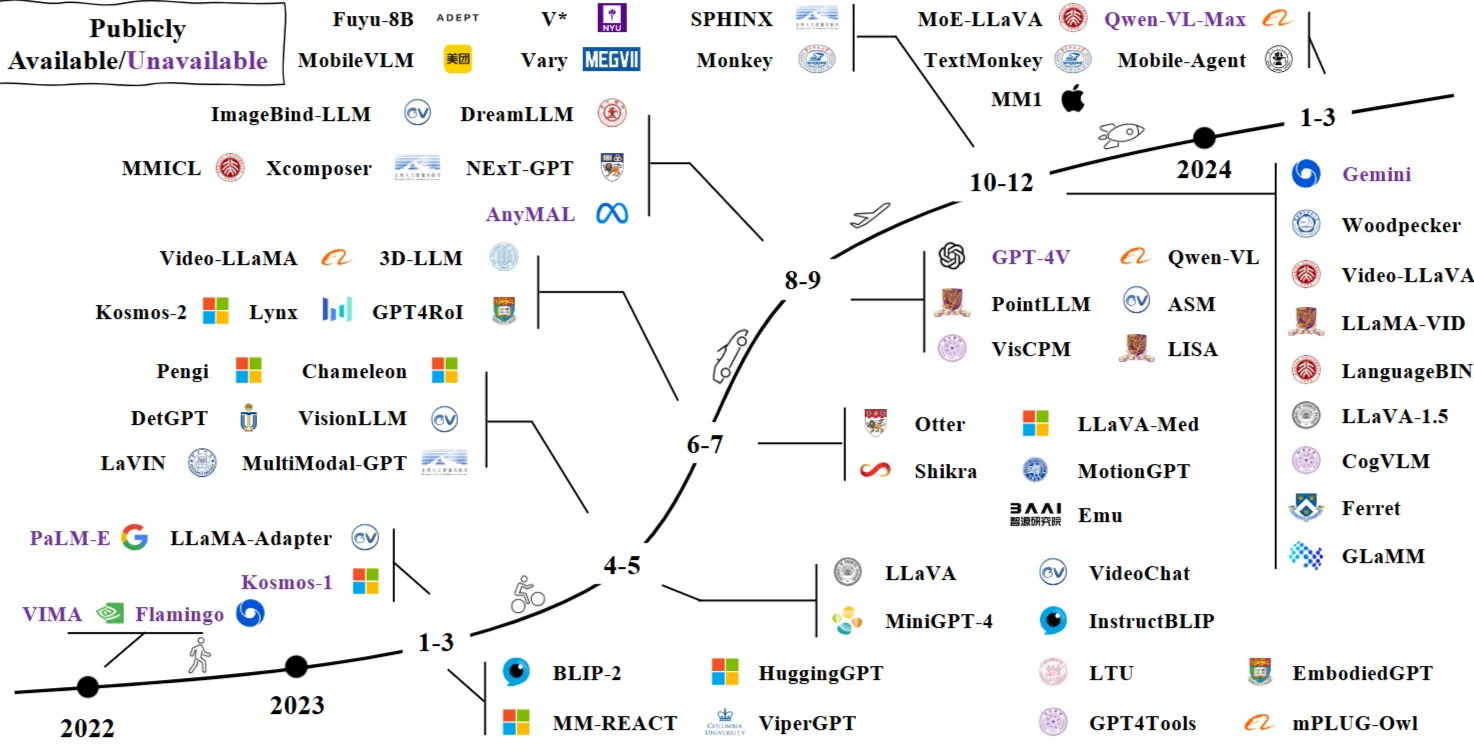 Fig. 1: A timeline of representative MLLMs. We are witnessing rapid growth in this field. More works can be found in our released GitHub page, which is updated daily.