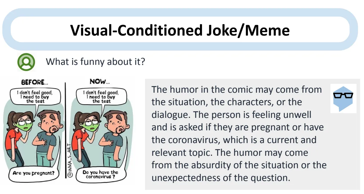 - MM-REACT처럼, 이미지를 보고 단순히 무엇이 있는지 설명하는 것을 넘어, "이 밈(meme)이 왜 웃긴지"처럼 겉으로 드러나지 않는 '숨겨진 의미'까지 해석할 수 있습니다.