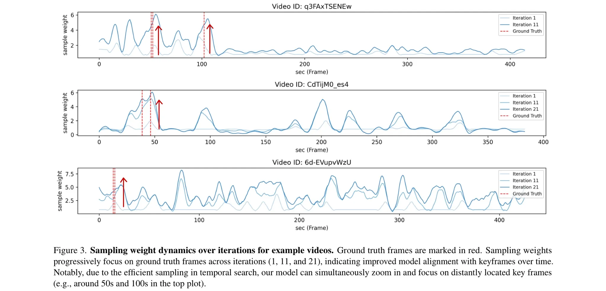 Figure 3을 보면 Iterative Temporal Search 과정이 반복될수록 정답 프레임을 샘플링할 확룔이 증가하고 있다.