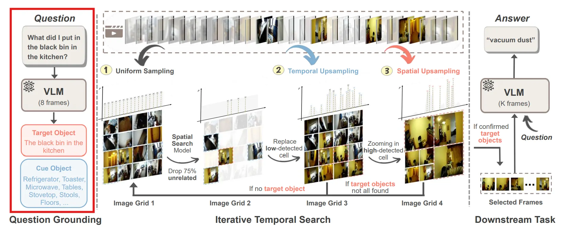 VLM이 질문을 받았을 때, 답변하기 위해 필요한 비디오 프레임을 찾는 과정이다.