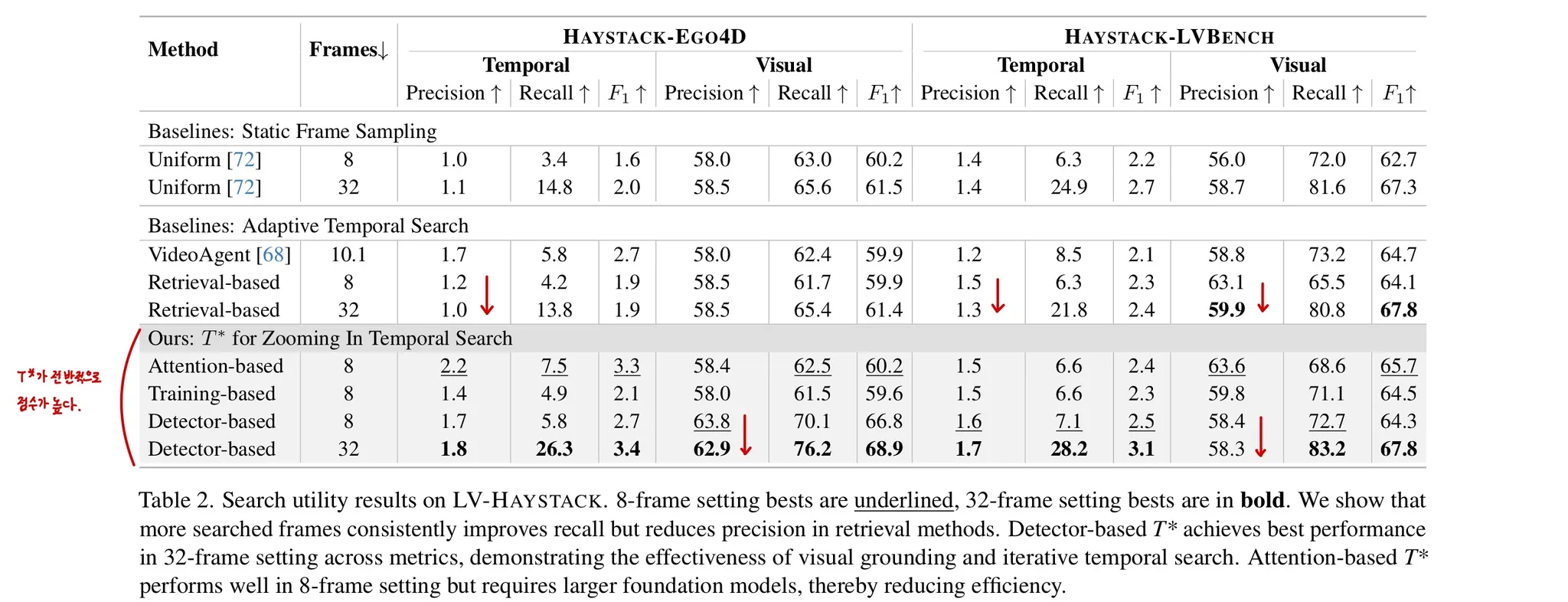 ⇒ 논문은 Temporal Search 능력을 평가할 수 있는 LV-HAYSTRACK 벤치마크를 제작하였다. 해당 벤치마크는 대부분이 1인칭 시점의 데이터라는 특징이 있다. 그리고 비디오 이해를 위한 Temporal Search 능력을 향상시키기 위해 비디오 프레임을 넓게 펼쳐서 검색을 수행하는 T* 프레임워크를 제안한다.