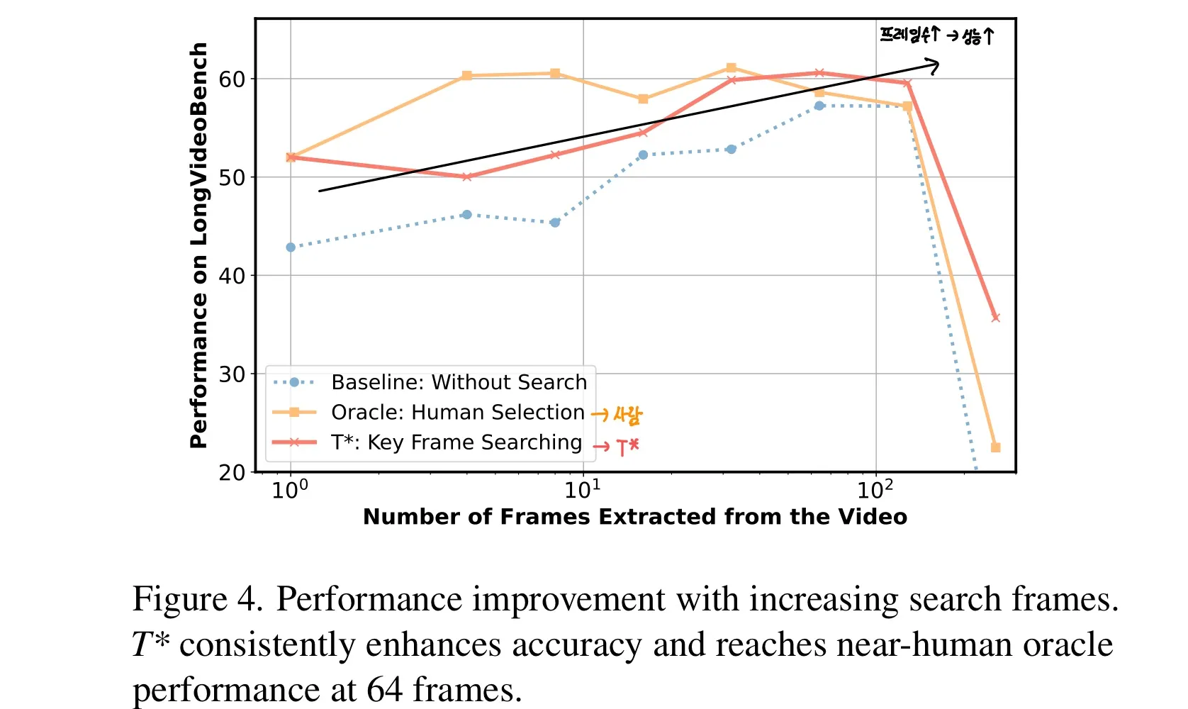 Figure 4를 보면 검색된 Key 프레임의 수, 즉 VLM이 질문에 답하기 위해 사용하는 프레임 수가 증가할수록 성능이 향상된다.
