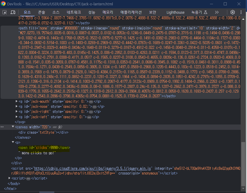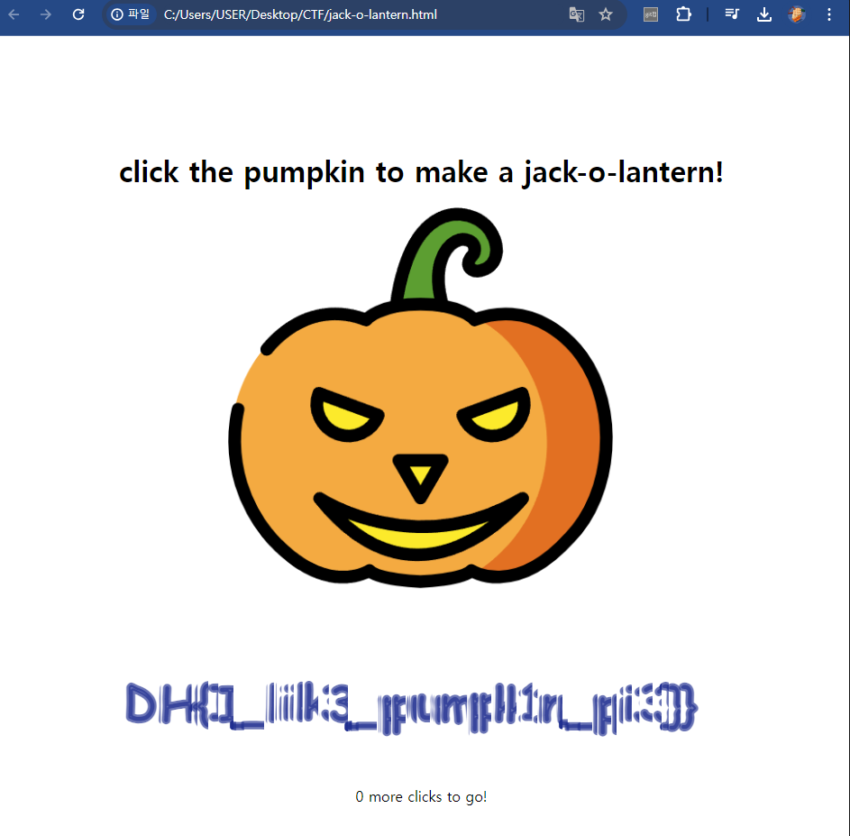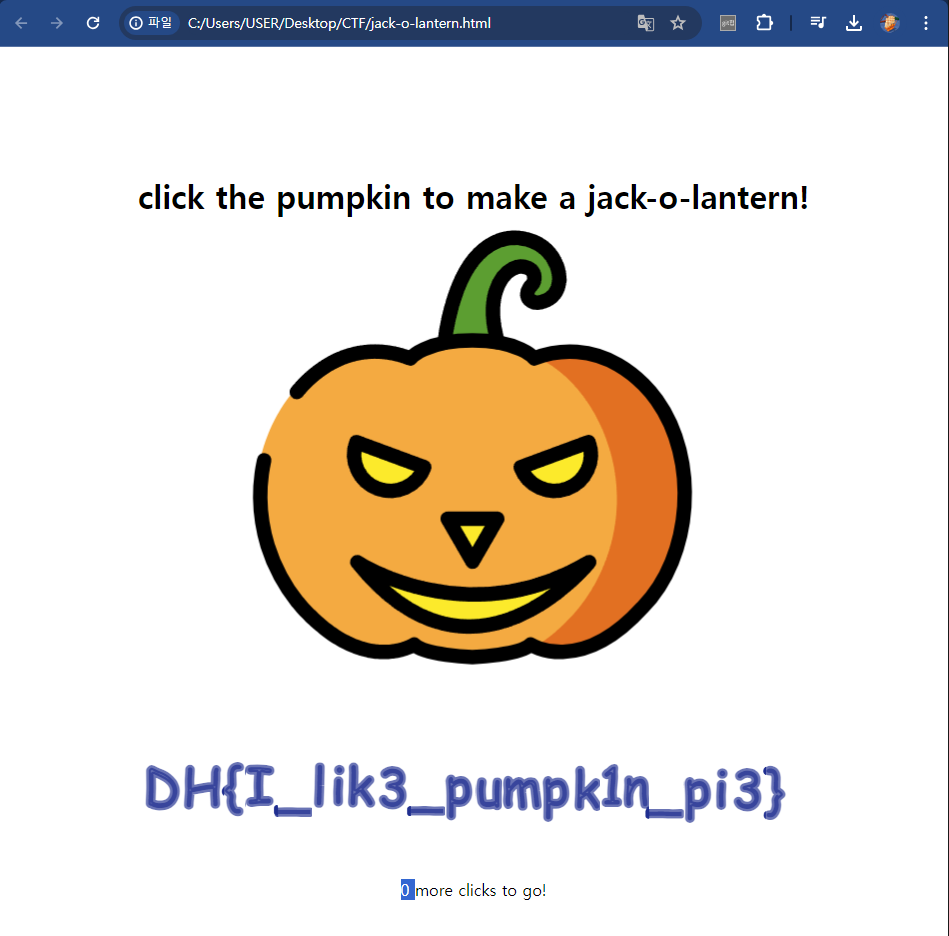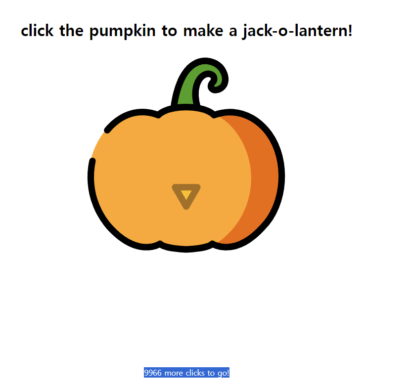 #jack-target 요소(잭오랜턴)를 클릭했을 때, 발생하는 이벤트를 처리한다. 클릭을 하면 counter가 증가하고, counter가 counter <= 10000 && counter % 100 == 0을 만족하는지 확인해 pumpkin 배열을 변경하고 make() 함수를 호출한다.