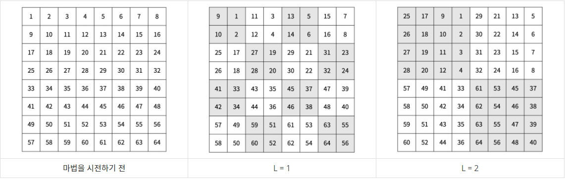 아래 그림의 칸에 적힌 정수는 칸을 구분하기 위해 적은 정수이다.