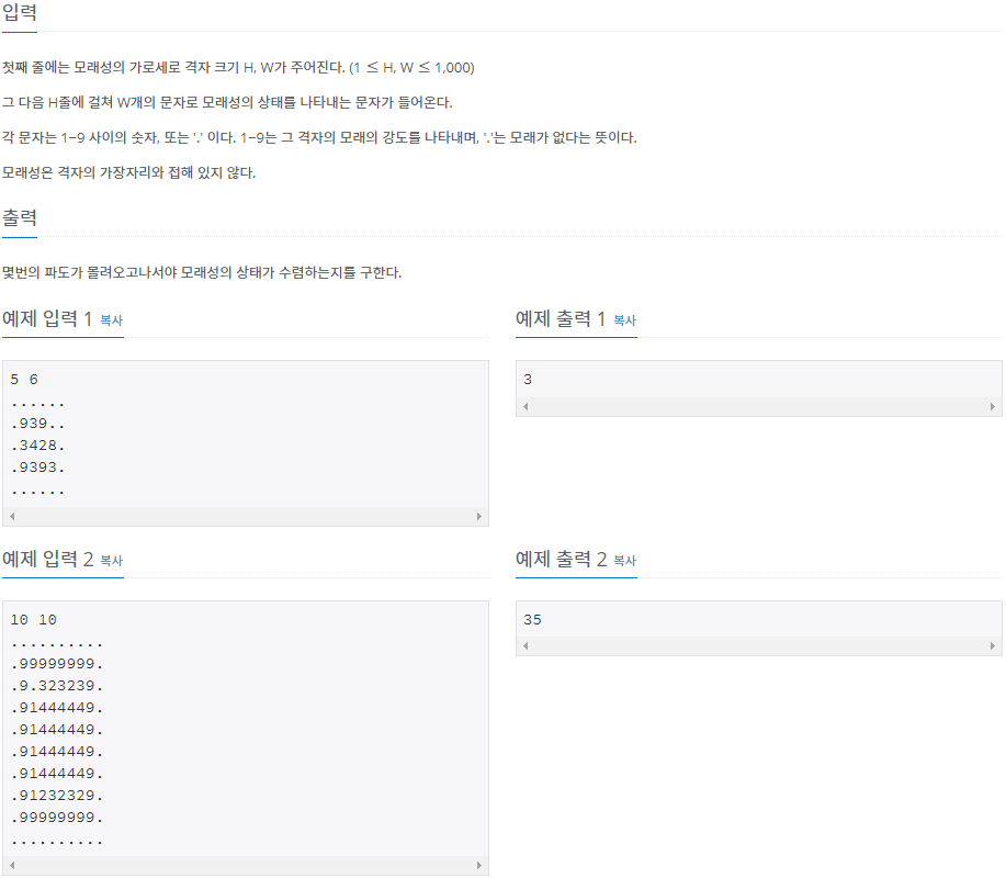 board의 str값으로 된 단단함을 int타입으로 바꾸고, 물의 좌표를 저장cnt_list를 생성하여 파도가 치는 횟수를 저장pop해가며 모래의 단단함을 감소waters에 추가하고, 해당 모래가 무너지는데 걸린 횟수를 cnt_list에 저장하여 answer를 갱신water가 존재하는 동안 반복📌 모래의 좌표를 저장하여 계산하면 시간초과, 물의 좌표를 저장하여 계산하여야 한다
