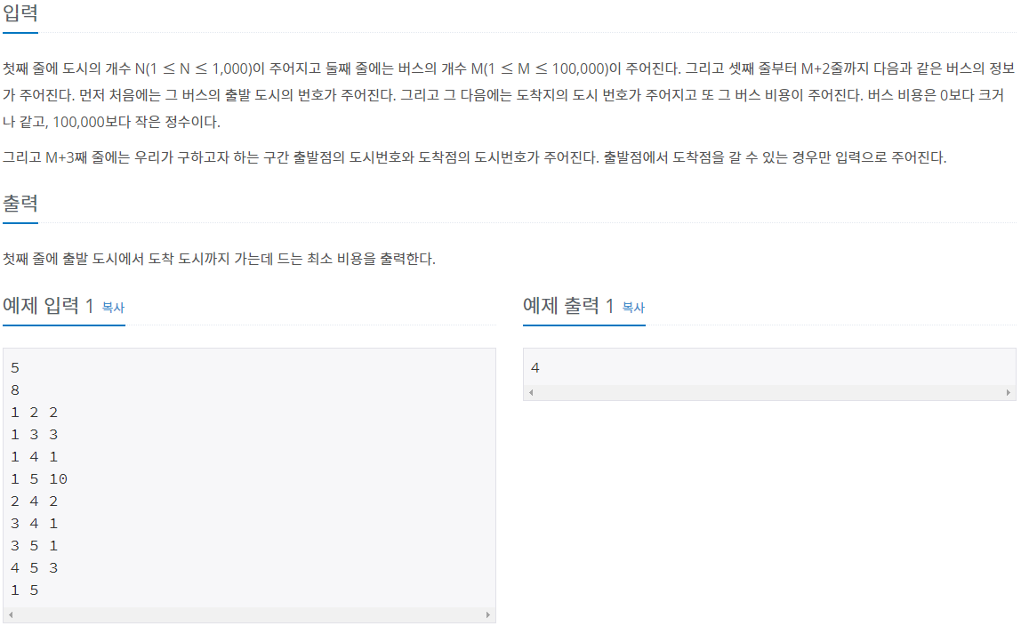 N개의 도시가 있다. 그리고 한 도시에서 출발하여 다른 도시에 도착하는 M개의 버스가 있다.
