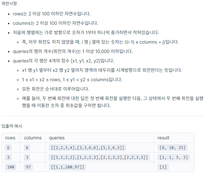 행렬의 세로 길이(행 개수) rows, 가로 길이(열 개수) columns, 그리고 회전들의 목록 queries가 주어질 때,