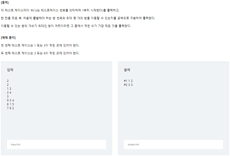 처음 어떤 수가 적힌 방에서 있어야 가장 많은 개수의 방을 이동할 수 있는지 구하는 프로그램을 작성하라.