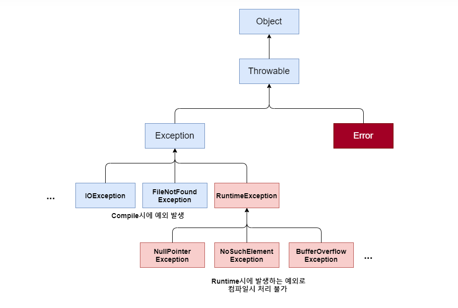 - Exception은 프로그램 실행 중 발생할 수 있는 예외 상황을 다루기 위한 Java의 오류 처리 시스템입니다.