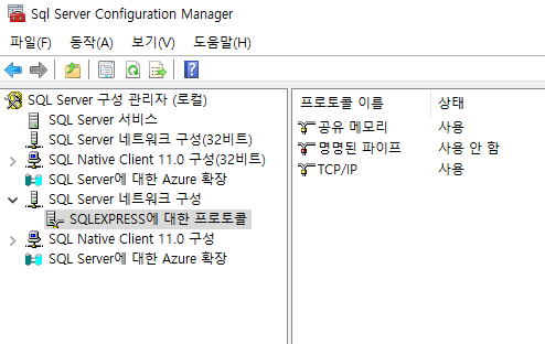 Sql Server Configuration Manager => SQL Server 네트워크 구성 => SQLEXPRESS에 대한 프로토콜 => TCP/ID 우클릭 후 사용 =>