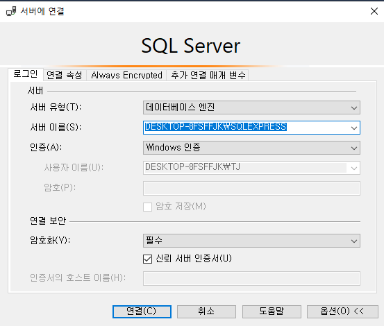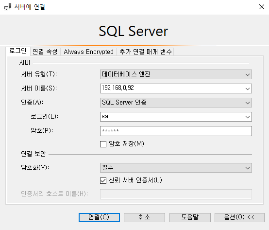 만일 집에서 재택근무를 하다가 사용해야 할 경우에는 서버 이름(S)에 회사에서의 DB서버 IP를 받아 기입해주고 아래와 같이 기입해주면 접속할 수 있게 된다. 하지만 지금 실습을 위해서는 세팅을 하나 해야하는데..