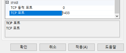 누구든 접속할 수 있도록 하기 위해서는 TCP/IP 우클릭 => 속성 => ip주소 => IPALL TCP포트에 1433을 기입하여 포트를 열어줄 수 있다.