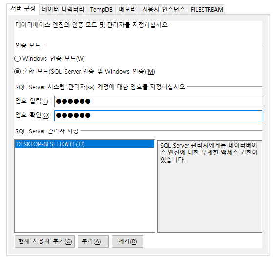 window인증모드로 설치를 할시 sql 로그인을 할수가 없기 때문에 혼합모드로 체크를 해줘야한다 ! !