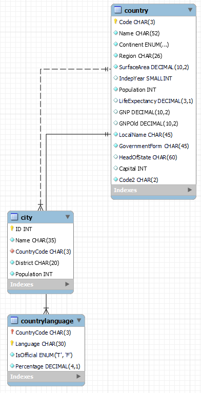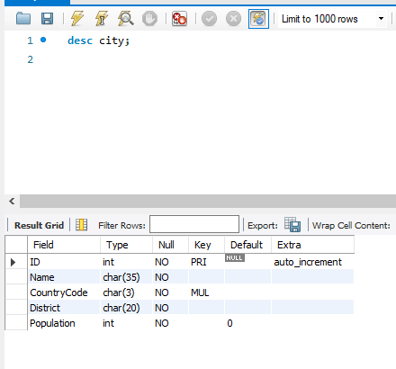 desc = city 테이블이 스키마(각 컬럼의 이름과 타입)을 보여준다.