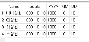 CREATE VIEW BirthdayView as SELECT name, Birthday bdate, substr(Birthday,1, 4)YYYY, substr(Birthday,6, 2)MM, substr(Birthday,9, 2)DD FROM Person;