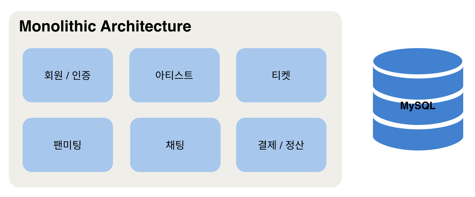 만일 이를 Monolithic Architecture로 구현한다면 각 도메인의 장애는 단일 장애점으로 동작합니다.