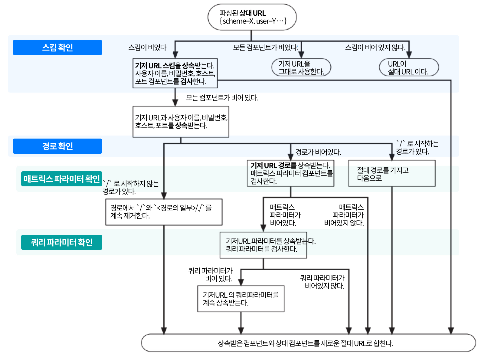 <base> HTML 태그를 기술할 수 있다.상대 URL과 기저 URL을 각각의 컴포넌트 조각으로 나누는 것이다. (=URL 분해하기)