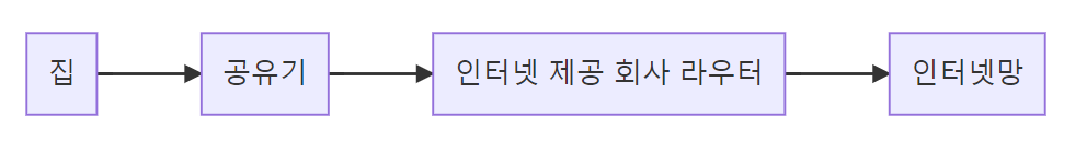 - 집 컴퓨터에서 인터넷에 접속하려는 경우 집-> 공유기 -> 인터넷 제공 회사 라우터 -> 인터넷망 같은 경로를 따름'