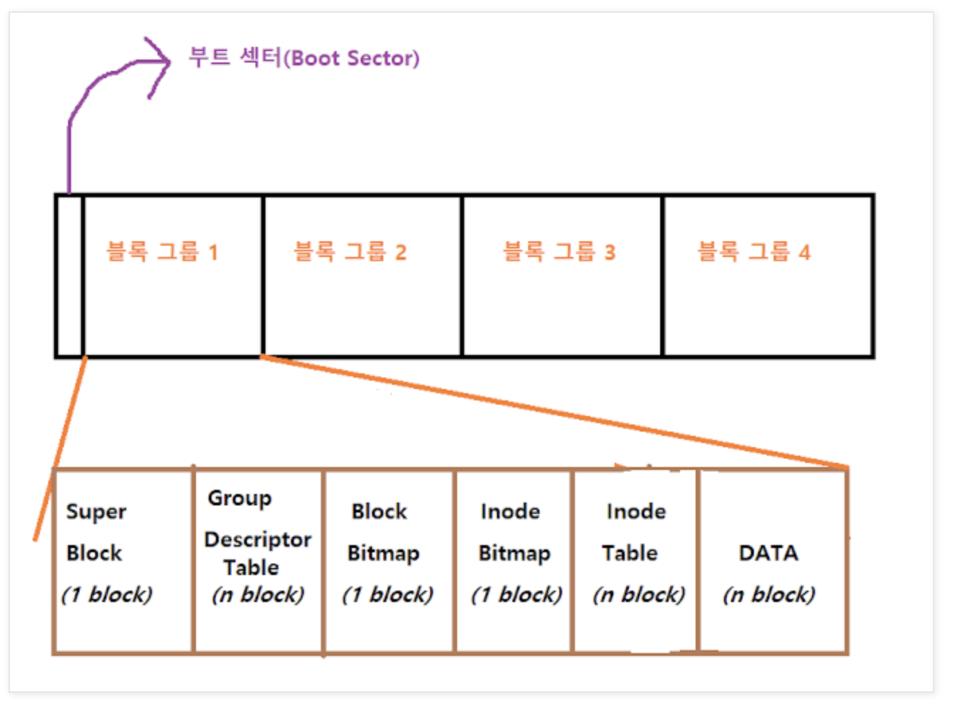 디스크 공간을 맨 앞에 부팅을 위한 boot sector와 block group로 나눈다.